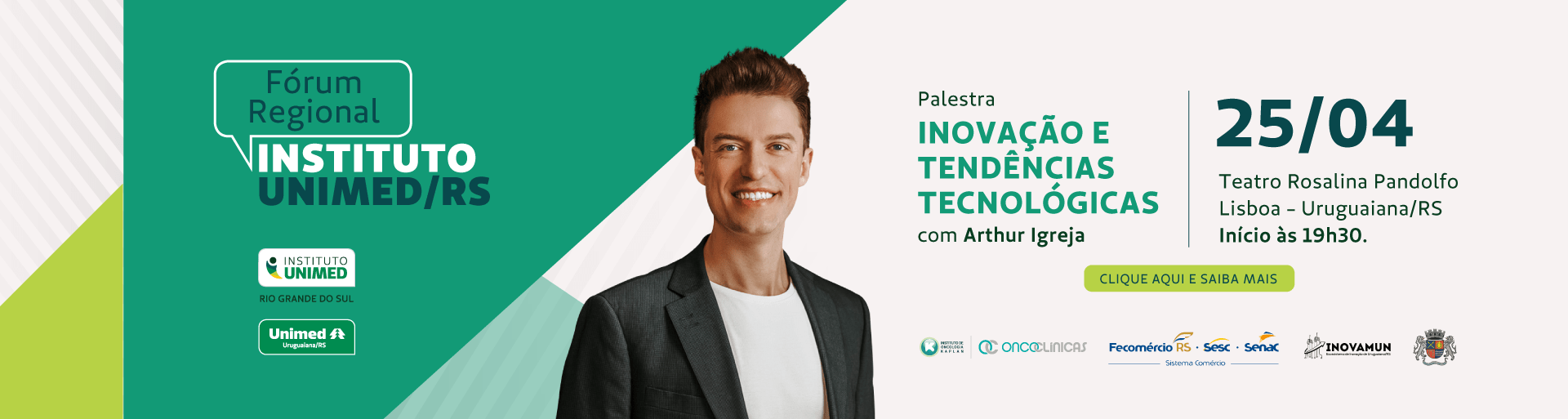 Vem aí o Fórum Regional Unimed/RS trazendo o tema Inovação e Tendências Tecnológicas com o renomado palestrante Arthur Igreja. 🎤✨