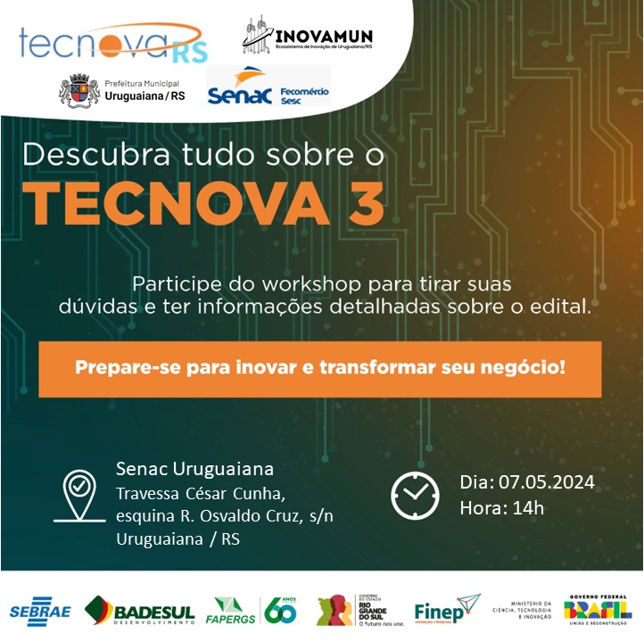 No dia 07 de maio às 14h será realizado no Auditório do Senac Uruguaiana, o Workshop sobre o Edital Tecnova 3.